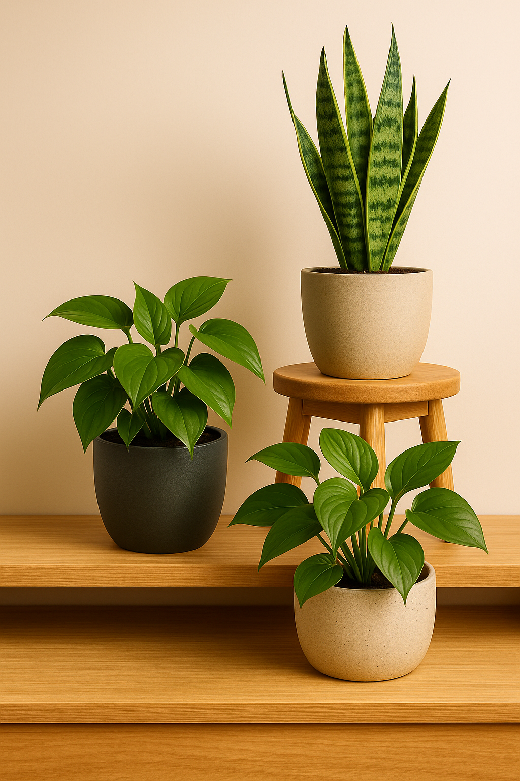 2–3 hardy, low-maintenance plants (think pothos, snake plants, or philodendrons).